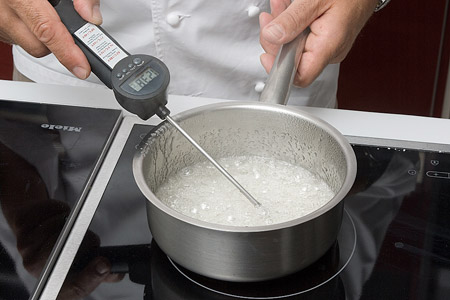 Συμβουλή Εάν δεν διαθέτουμε θερμόμετρο, μπορούμε να διαπιστώσουμε τη θερμοκρασία του σιροπιού, αν ρίχνοντας λίγο μέσα σε ένα ποτήρι με κρύο νερό, δημιουργηθεί μία κλωστή.