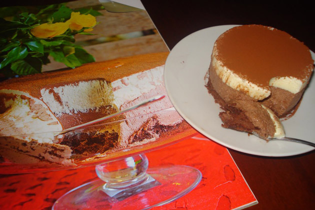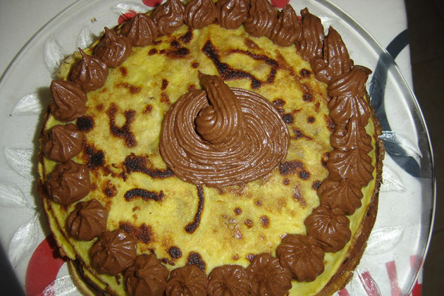Ο Νίκος Μπάλης έφτιαξε την τούρτα με κρέπες και μους σοκολάτας από το τεύχος 6 (σελ. 117).