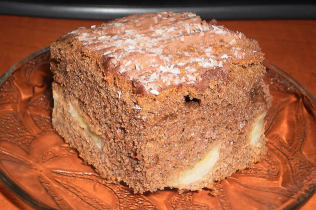 Η Χρύσα Πλουμίδη έφτιαξε το κέικ με κακάο και μπανάνες από το τεύχος 25 (σελ. 126) και το εμπλούτισε με επικάλυψη σοκολάτας και καρύδα.