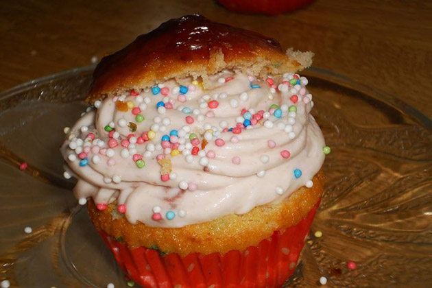 Η Χρύσα Πλουμίδη πειραματίζεται με τα μικρά κέικ ελαιολάδου του τεύχους 33 (σελ. 55) μόνο που τα σιροπιάζει και προσθέτει γέμιση κρέμας τυριού και σπιτική μαρμελάδα φράουλα.