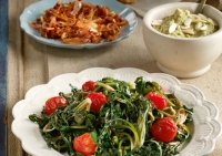 Τα μελωμένα κρεμμύδια και τα καβουρδισμένα αμύγδαλα μαζί με τη γλύκα από τα ντοματίνια εξισορρόπησαν τα πικρά αλλά εύγευστα χόρτα. Η γεύση αυτού του φαγητού μάς έμεινε αξέχαστη!