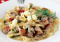 Υλικά για 4 άτομα: περίπου 1½ φλιτζ. τσαγιού υπόλοιπο ψητό ψαρονέφρι ή κοτόπουλο ή μπριζόλα, σε κυβάκια, 1 πακέτο φαρφάλες ή άλλο ζυμαρικό της αρεσκείας μας, 200 γρ. φρέσκα μανιτάρια λευκά, 3 σκελίδες σκόρδου, ψιλοκομμένες 1/3 φλιτζ. τσαγιού ελαιόλαδο, 1...