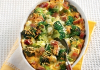 Υλικά για 1 ταψί διαμ. 22 εκ.: 2 - 3 φλιτζ. τσαγιού βρασμένο μπρόκολο ή κουνουπίδι (τα μεγάλα «μπουκετάκια» και τα πιο σκληρά κοτσάνια από το λαχανικό τα κόβουμε σε μικρότερα για να απλωθούν ομοιόμορφα στο ταψί), 150 γρ. καπνιστό μπέικον ή γαλοπούλα ή...