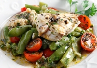 Μελωμένο ψάρι με λαχανικά και μπόλικο σκορδάκι.