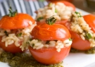 Μαγειρεμένη, αρωματική γέμιση μέσα σε ωμή ντομάτα. Τι ωραία κόντρα!