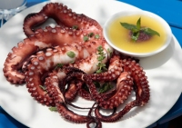 Ψητό χταποδάκι στο φούρνο. Με τα υγρά που θα βγάλει στο ταψί και συμπληρώνοντας λίγο κρασί και ζωμό μπορούμε να φτιάξουμε ένα πιλάφι.