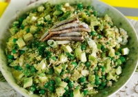 Πιάτο με κινόα, αβοκάντο, κρεμμυδάκια, αγγούρι, άνηθο και μάραθο.