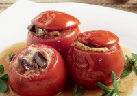 Υλικά (για 4 άτομα ως μεζέ ή για 2 ως κύριο): 4 μικρές ντομάτες, ώριμες αλλά σφιχτές, φύλλα γλιστρίδας ή ρόκας ή άλλο εποχικό σαλατικό της αρεσκείας μας. Για τη γέμιση: περίπου 1 μερίδα ιμάμ, 80 γρ. φέτα, της αρεσκείας μας, θρυμματισμένη, 2 κουτ. σούπας...