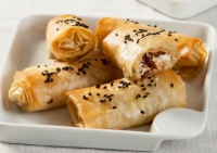 • Ρολάκια με φύλλο κρούστας, κατίκι Δομοκού, λιαστές ντομάτες και βασιλικό