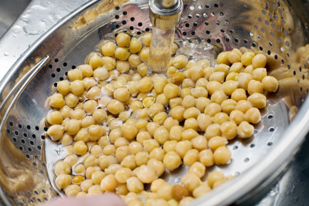 Αδειάζουμε τα ρεβίθια με τα φλούδια τους σε ένα βαθύ μπολ, γεμίζουμε νερό και ανακατεύουμε με το χέρι ώστε τα φλούδια να έρθουν στην επιφάνεια και να τα αφαιρέσουμε. Δεν πειράζει αν μείνουν και μερικά φλούδια. Ξεπλένουμε τα ρεβίθια και πάλι πολύ καλά, για να μην μείνει η γεύση της σόδας. Επαναλαμβάνουμε και με τα υπόλοιπα ρεβίθια.