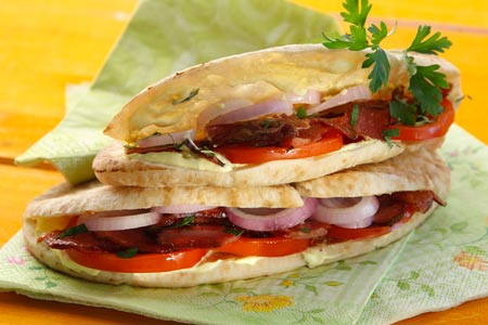 Χαράζουμε τις κυπριακές πίτες οριζόντια στη μία τους άκρη με ένα μαχαίρι, φτιάχνοντας μια βαθιά σχισμή, σαν τσέπη, αλείφουμε το εσωτερικό κάθε μίας με 2 κουτ. γλυκού από το μείγμα γιαουρτιού - μουστάρδας και γεμίζουμε με 3 - 4 φέτες ντομάτας, μερικές φετούλες απάκι και μερικές ροδέλες κρεμμυδιού. Τέλος, βάζουμε από λίγο ψιλοκομμένο μαϊντανό. Πιέζουμε ελαφρώς τις πίτες και τις σερβίρουμε σκέτες ή με σαλάτα της αρεσκείας μας. Αν χρησιμοποιήσουμε αραβικές πίτες, τις γεμίζουμε με τα υλικά και τις τυλίγουμε σφιχτά σε ρολό.