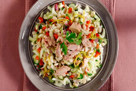 Βάζουμε σε ένα μπολ τα φασόλια, τα αλατίζουμε ελαφρώς (έχουν και τα κρεμμύδια και η σάλτσα το αλάτι τους) και τα περιχύνουμε με τη σάλτσα. Ανακατεύουμε προσεχτικά και προσθέτουμε τα μυρωδικά, το σέλερι, την πιπεριά, τον τόνο κομματιασμένο, το ψητό κρεμμύδι και φρεσκοτριμμένο πιπέρι. Ανακατεύουμε και πάλι απαλά και σερβίρουμε με φρυγανιές ή παξιμάδια της αρεσκείας μας. Η σαλάτα μπορεί να μείνει στο ψυγείο. Την επομένη είναι νοστιμότερη.