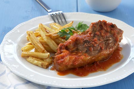 Σε μια φαρδιά και ρηχή κατσαρόλα με βαρύ πάτο, ζεσταίνουμε το λάδι σε μέτρια φωτιά και τσιγαρίζουμε τις μερίδες του κρέατος μέχρι να ροδίσουν όσο γίνεται από όλες τις πλευρές. Αν δεν χωράνε στην κατσαρόλα μονομιάς, είναι προτιμότερο να τσιγαρίσουμε το κρέας σε δύο δόσεις. Βγάζουμε τις μερίδες του κρέατος σε μια πιατέλα ή σε ταψί.