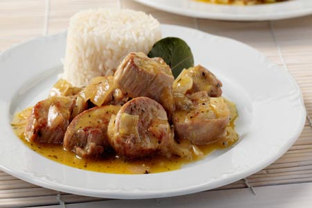 Σε μια ρηχή και φαρδιά κατσαρόλα ζεσταίνουμε το λάδι σε δυνατή φωτιά και σοτάρουμε σε δύο δόσεις τα κομμάτια του κρέατος, μέχρι να ροδίσουν ομοιόμορφα από όλες τις πλευρές. Δεν σοτάρουμε όλη την ποσότητα μεμιάς, γιατί τότε το κρέας θα βράσει μέσα στα υγρά του αντί να σοταριστεί σωστά και να ροδίσει.