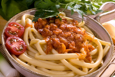 Μακαρονάδα με ντοματίνια και κιμά από λουκάνικο