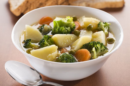 Διαδικασία Σε μια κατσαρόλα ζεσταίνουμε το λάδι σε μέτρια φωτιά. Ρίχνουμε το κρεμμύδι και το σέλερι και τα σοτάρουμε για 2-3 λεπτά, ανακατεύοντας με μια κουτάλα. Μετά προσθέτουμε διαδοχικά το καρότο, το κουνουπίδι και το μπρόκολο σοτάροντας το καθένα για 1 λεπτό προτού προσθέτουμε το επόμενο. Προσθέτουμε τις πατάτες, την ντομάτα και αλατοπίπερο και αφήνουμε το φαγητό να πάρει 1-2 βράσεις. Μετά προσθέτουμε το νερό και βράζουμε για περίπου 10-15 λεπτά ή μέχρι να μαλακώσουν τα καρότα και οι πατάτες και να «δέσει» κάπως η σούπα.
