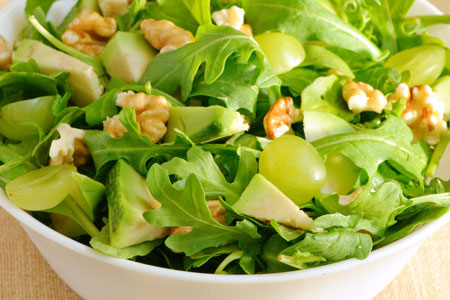 Διαδικασία Κόβουμε τις ρόγες του σταφυλιού στη μέση, αν είναι μεγάλες. Βάζουμε σε ένα μπολ τη ρόκα, το λάδι, το χυμό και το ξύσμα λεμονιού και αλατοπίπερο. Ανακατεύουμε καλά και βάζουμε τη σαλάτα σε μια σαλατιέρα. Κόβουμε το τυρί σε φλούδες με το peeler ή από την πλευρά του τρίφτη με τις μακριές εσοχές. Γαρνίρουμε τη σαλάτα με τις ρόγες του σταφυλιού, τους ξηρούς καρπούς και τις φλούδες του τυριού. Συνοδεύουμε με ψωμί ολικής άλεσης ή άλλο της αρεσκείας μας.