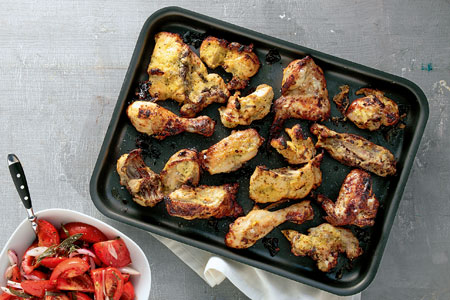 Βάζουμε σε ένα μεγάλο μπολ όλα τα υλικά (εκτός από το κοτόπουλο) και τα ανακατεύουμε καλά με ένα πιρούνι ή με το σύρμα. Βάζουμε τα κομμάτια του κοτόπουλου και τα ανακατεύουμε καλά να βραχούν από όλες τις πλευρές με το μείγμα. Τα αραδιάζουμε σε ένα ταψί, σε μονή στρώση, και τα ψήνουμε για 25-30 λεπτά ή μέχρι να ροδίσουν αλλά να ψηθούν και στο εσωτερικό τους. Δεν βάζουμε νερό στο ταψί, παρά μόνο αν σωθούν εντελώς τα υγρά. Αν χρειαστεί, ψήνουμε λίγο περισσότερο - ελέγχουμε κόβοντας ένα κομμάτι. Σερβίρουμε το φαγητό ζεστό και το συνοδεύουμε με βλίτα βραστά με μπόλικο δυόσμο, πατάτες τηγανητές ή φούρνου (που μπορούμε να ψήσουμε όση ώρα ψήνονται τα «παϊδάκια», αρκεί να γυρίσουμε τη λειτουργία του φούρνου στον αέρα), και δροσερό γιαούρτι.