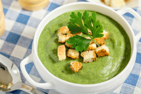 Σερβίρουμε με τριμμένη φέτα ή ανθότυρο (αν δεν τα βάλαμε στην πολτοποίηση) και κρουτόν ή φρυγανισμένο ψωμί. Για πιο χορταστικό αποτέλεσμα, στο τραπέζι σερβίρουμε αυγά βραστά ή μια απλή ομελέτα.