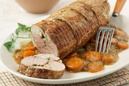 Βγάζουμε το ρολό σε πιατέλα και κόβουμε και αφαιρούμε τους σπάγκους. Σερβίρουμε με τα κρεμμυδάκια και τα καρότα.