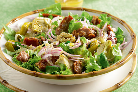 Χορταστική σαλάτα µε αγκιναράκια λαδιού και αρνί