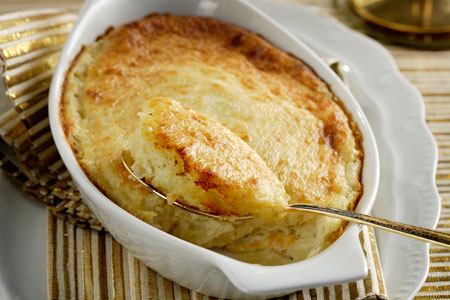 Χτυπάμε τα ασπράδια στον κάδο του μίξερ με το σύρμα ή σε ένα μπολ με το μίξερ χειρός μέχρι να γίνουν μαρέγκα (όχι πολύ σφιχτή). Ενσωματώνουμε τη μαρέγκα στον πουρέ προσεκτικά για να μην ξεφουσκώσει. Βάζουμε τον πουρέ σε ένα βουτυρωμένο ή λαδωμένο πυρέξ μεσαίου μεγέθους. Ψήνουμε γύρω στα 50 - 60 λεπτά, μέχρι να κάμει μια χρυσαφένια κρούστα. Σερβίρουμε αμέσως.