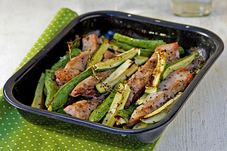 Χοιρινό στο φούρνο με μικρά κολοκυθάκια, δυόσμο και θυμάρι