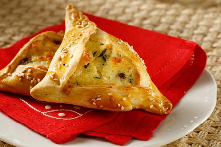 Βάζουμε στο κέντρο κάθε πίτας 1 - 2 μεγάλες κουταλιές από το μείγμα της γέμισης. Διπλώνουμε το πάνω μέρος του φύλλου προς το κέντρο, χωρίς να σκεπάσουμε τη γέμιση. Κάνουμε το ίδιο και με το κάτω δεξί και το κάτω αριστερό μέρος του φύλλου. Το αποτέλεσμα είναι ένα τυροπιτάκι με σχήμα τριγωνικό και τη γέμιση στο κέντρο να εξέχει. Προθερμαίνουμε το φούρνο στους 200° C.