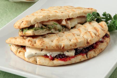 Στις μισές πίτες (στα «μισοφέγγαρα» δηλαδή) απλώνουμε το μείγμα του μούλτι. Μοιράζουμε και τις φέτες κοτόπουλου, αλατοπιπερώνουμε και καλύπτουμε με τη γραβιέρα. Τις υπόλοιπες πίτες τις αλείφουμε με το υπόλοιπο λάδι (2 κουταλιές) και τις πασπαλίζουμε με το ξερό μυρωδικό της επιλογή μας. Με αυτές σκεπάζουμε τα σάντουιτς. Τα βάζουμε προσεχτικά στην τοστιέρα και τα ψήνουμε για περίπου 4 λεπτά, μέχρι να ροδίσουν εξωτερικά και να λιώσει το τυρί.