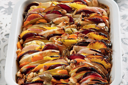 ΔιαδικασίαΚαθαρίζουμε και κόβουμε τα λαχανικά και τα φρούτα σε πολύ λεπτές στρογγυλές φέτες (ιδανικά πάχους 3 χλστ.). Γι’ αυτή την εργασία χρησιμοποιούμε κοφτερό μαχαίρι ή, ιδανικά, το εργαλείο που λέγεται μαντολίνο (το βρίσκουμε σε μαγαζιά με εργαλεία κουζίνας). Βάζουμε τα λαχανικά σε ένα μπολ και τα φρούτα σε ένα άλλο. Στο μπολ με τα λαχανικά προσθέτουμε 150 ml ελαιόλαδο, αλάτι και πιπέρι. Στο μπολ με τα φρούτα προσθέτουμε 50 ml ελαιόλαδο, αλάτι, πιπέρι και το χυμό λεμονιού (για να μη μαυρίσουν τα φρούτα). Προθερμαίνουμε το φούρνο στους 160° C.