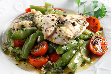 Μελωμένο ψάρι με λαχανικά και μπόλικο σκορδάκι.