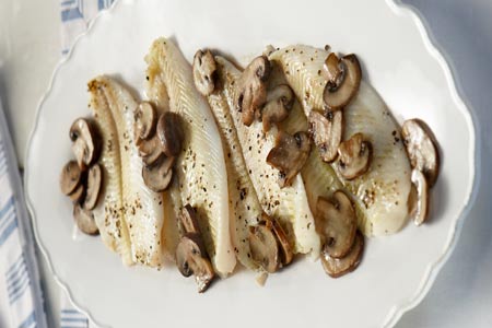 Λαδώνουμε καλά ένα ταψί με το υπόλοιπο λάδι, βάζουμε τα φιλέτα και περιχύνουμε με το περιεχόμενο του τηγανιού και το κρασί. Σκεπάζουμε καλά το ταψί με αλουμινόχαρτο ή λαδόκολλα και ψήνουμε για 10 λεπτά. Σερβίρουμε κάθε φιλέτο με μανιτάρια και λίγη σάλτσα. Πασπαλίζουμε με άφθονο αλατοπίπερο και, αν έχουμε, λίγο ψιλοκομμένο μαϊντανό. Συνοδεύουμε με ρύζι μπασμάτι βρασμένο με 1 δαφνόφυλλο και 4-5 μπαχάρια.