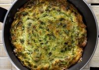 Πίτα της ανάγκης, η ελληνική cucina povera στα καλύτερά της. Χυλός με αλεύρι, αυγά, γάλα, γιαούρτι και ελάχιστο τυρί. Η σεφ την απογειώνει με μέλι και ξύσμα.