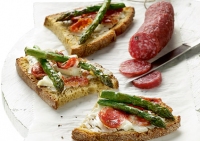 Μέχρι να τελειώσει η εποχή τους δοκιμάζουμε τα σπαράγγια σε διάφορες εκδοχές. Αυτή τη φορά σε μια γρήγορη και πεντανόστιμη μπρουσκέτα.